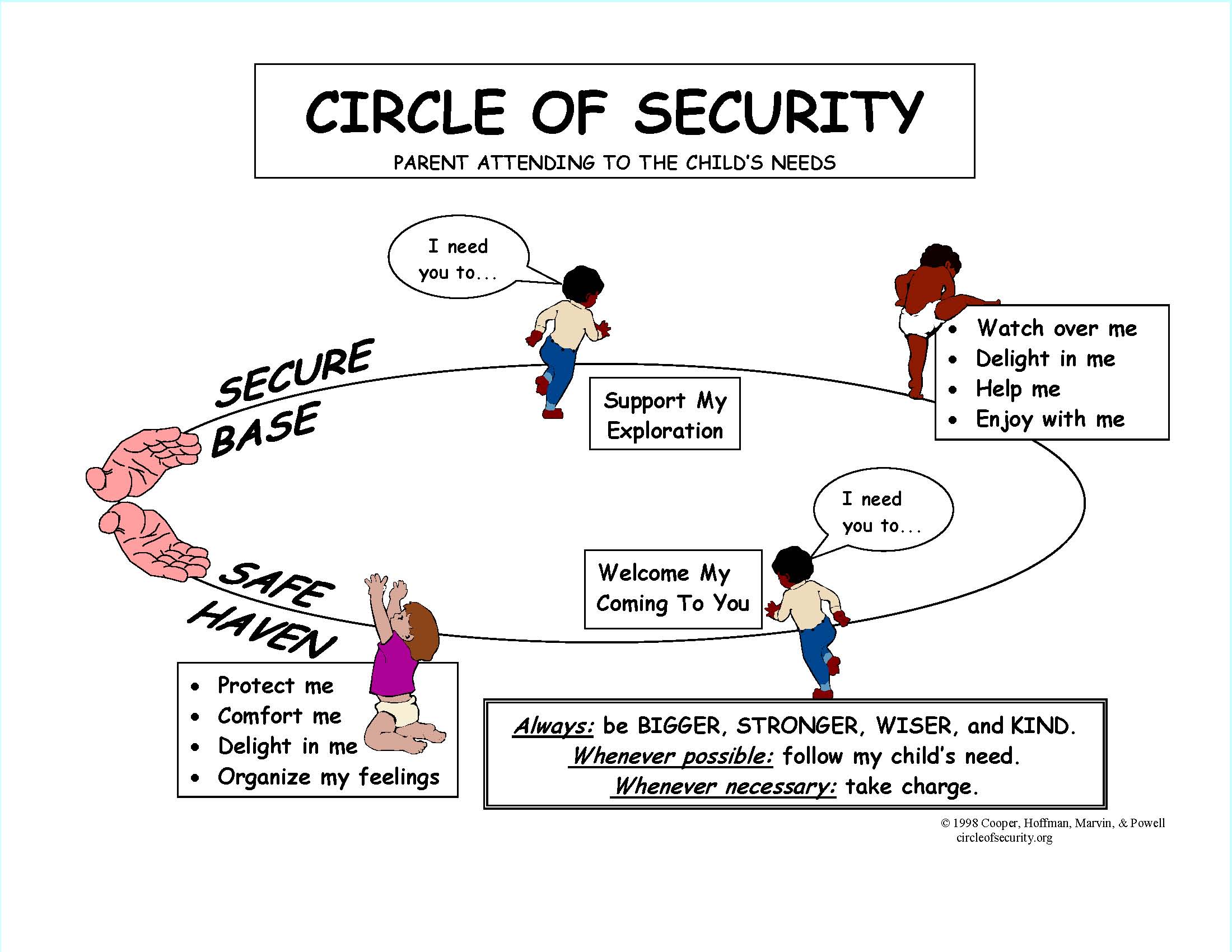 In secure attachment the parent is the safe, secure base from which the child can go off and explore, and return to as needed. To support secure attachment the parents supports the child’s exploration, and supports their return. The parent is Bigger, Stronger, Wiser and Kind. Read more detail here on travelling around the circle of security.